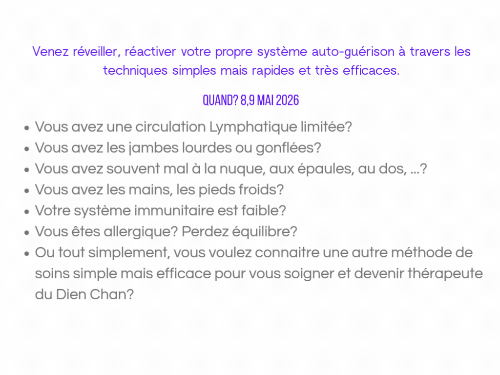 Le Dien Chan, une méthode de réflexologie faciale vietnamienne, permet à chacun d’apprendre des gestes simples et puissants pour soulager douleurs, tensions et déséquilibres émotionnels, sans matériel compliqué, où que vous soyez.
